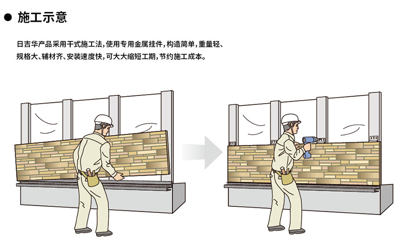 A9:日吉華產(chǎn)品采用干式施工法,使用**金屬掛件,構(gòu)造簡單,輕質(zhì)強(qiáng)度高,輔材齊全,安裝速度快,可縮短工期,節(jié)約施工成本。
